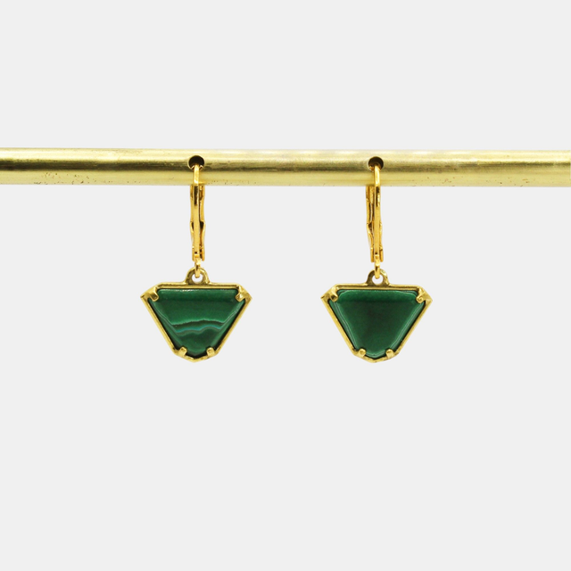 Ces boucles d’oreilles sont en laiton plaqué or 24 carats. Elles possèdent une forme graphique sertie d'une pierre fine naturelle qui est la malachite.